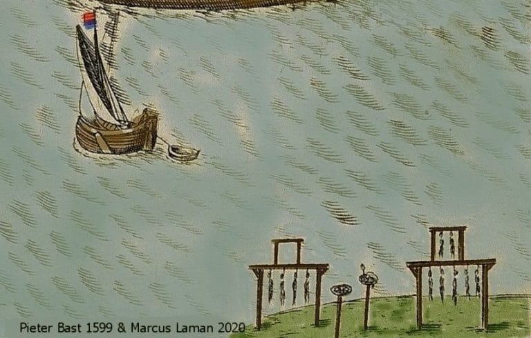 Helemaal onderaan de kaart van Amsterdam is nog net een stukje land te zien waarop wielen en galgen te zien zijn. Op deze gravure uit 1599 zijn elf personen opgehangen, waarvan twee in de verdieping van de galg. Er werden in Amsterdam gemiddeld vier personen per jaar opgehangen. Zie ook hier voor meer informatie.