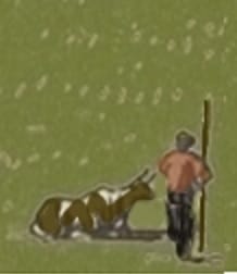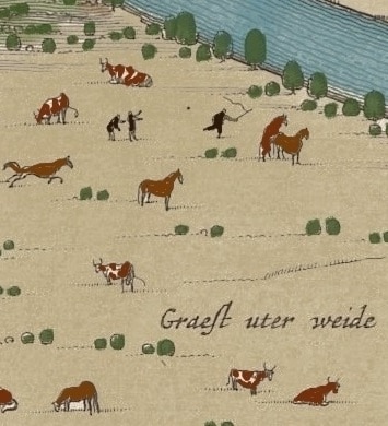 De Kaart Figuratief Delft 1678 laat in de weilanden rond de stad vele koeien en paarden zien. Op de poster zijn het kleine figuurtjes die bijna niet herkenbaar zijn. Dat geldt ook voor de boer met koe en de boerin met juk hier in beide afbeeldingen uitvergroot. Dit is mogelijk dankzij de hoge resolutie van het digitale bestand. Dan zie je dat de graveur ook daadwerkelijk zijn kwaliteit toont door met een paar lijntjes mens en dier tot ‘leven’ te wekken.