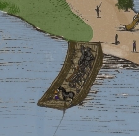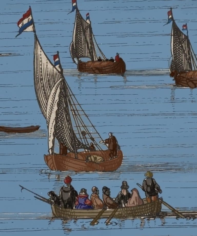 Sinds jaar en dag vaart er tussen Schoonhoven en Nieuwpoort een veerboot waar nog steeds veel auto’s gebruik van maken. Deze waren er in de zeventiende eeuw natuurlijk nog niet, maar wel paarden en wagens. Op deze uitsnede is te zien hoe de veerboot deze naar de overkant bracht.