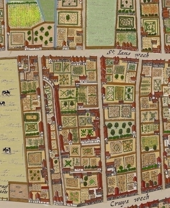 De meeste stadskaarten zijn gemaakt in de Gouden Eeuw (1609-1672) toen er vooral in de provincie Holland door de overzeese handel heel veel geld werd verdiend. Rond de steden, net buiten de vesting, verschijnen aangelegde tuinen in Franse stijl. In dit voorbeeld uit Haarlem zijn deze tuinen aangelegd op hogere gronden die op de oude strandwal liggen.