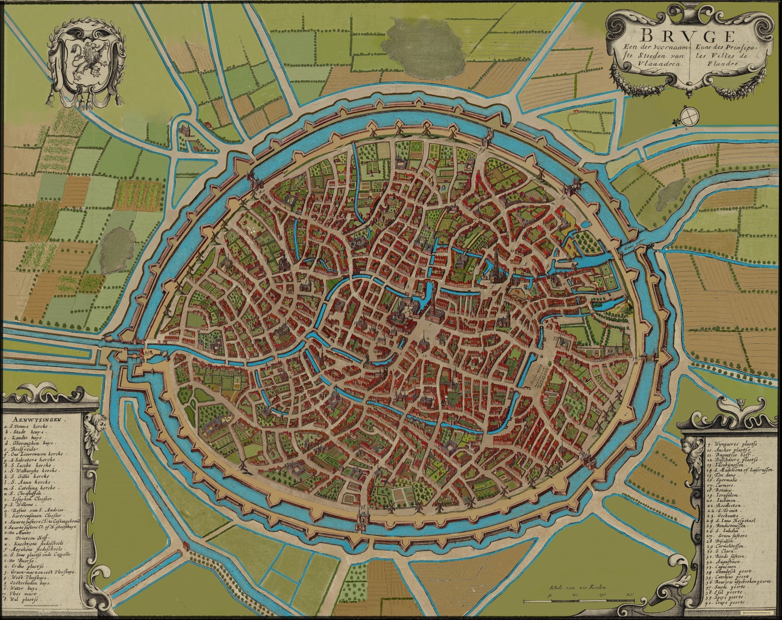 My interest in the development of urban and landscape structures has been the basis for colouring historical city maps. The immediate cause was the discovery on the internet of a city map from 1600 of Leiden. This one was made by Pieter Bast.