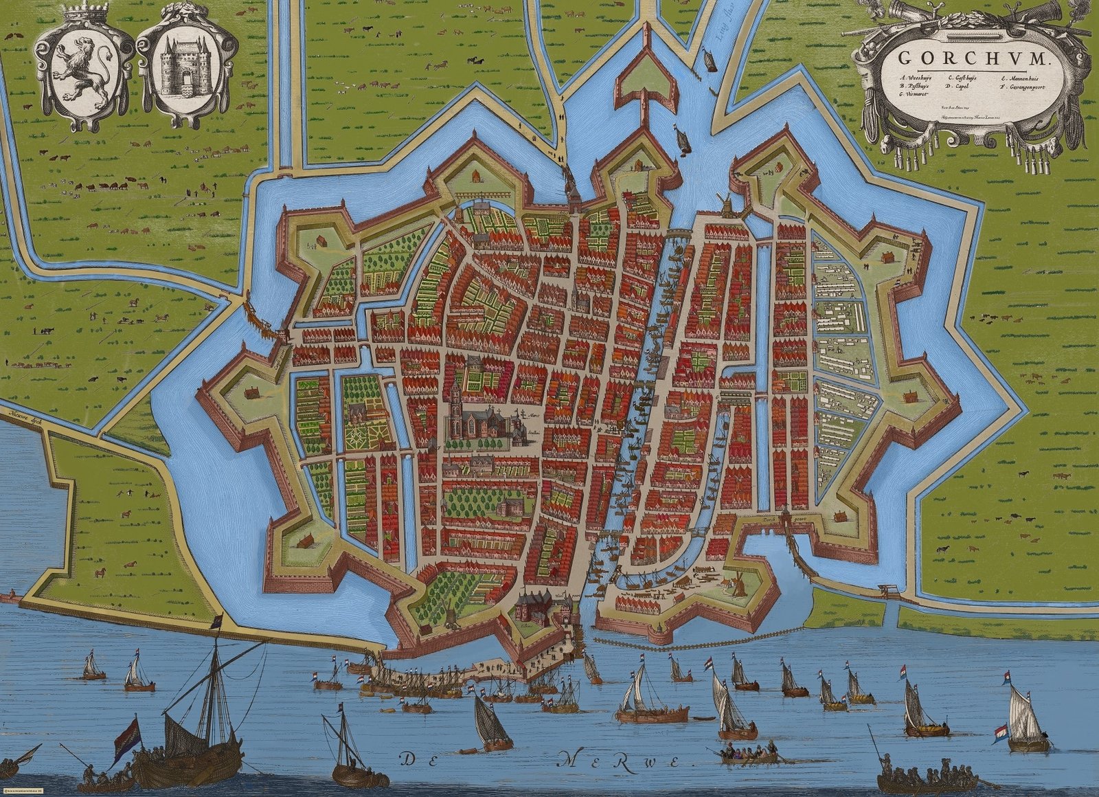 Deze vestingstad van de Oude Hollandse Waterlinie gelegen aan de Merwede zoals Johannes Blaeu die in 1646 tekende.